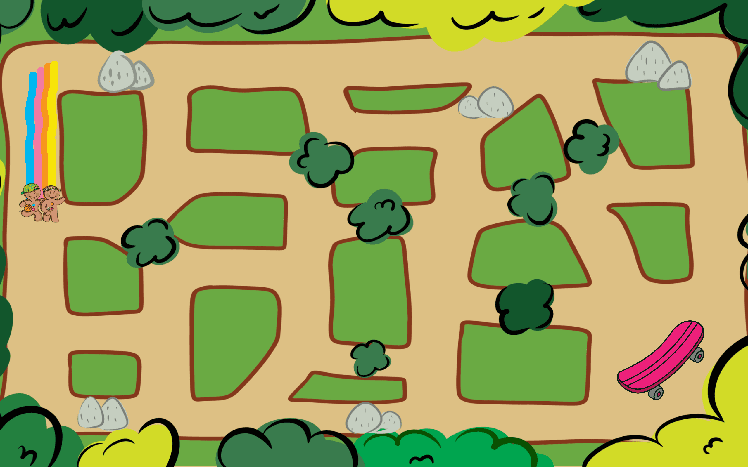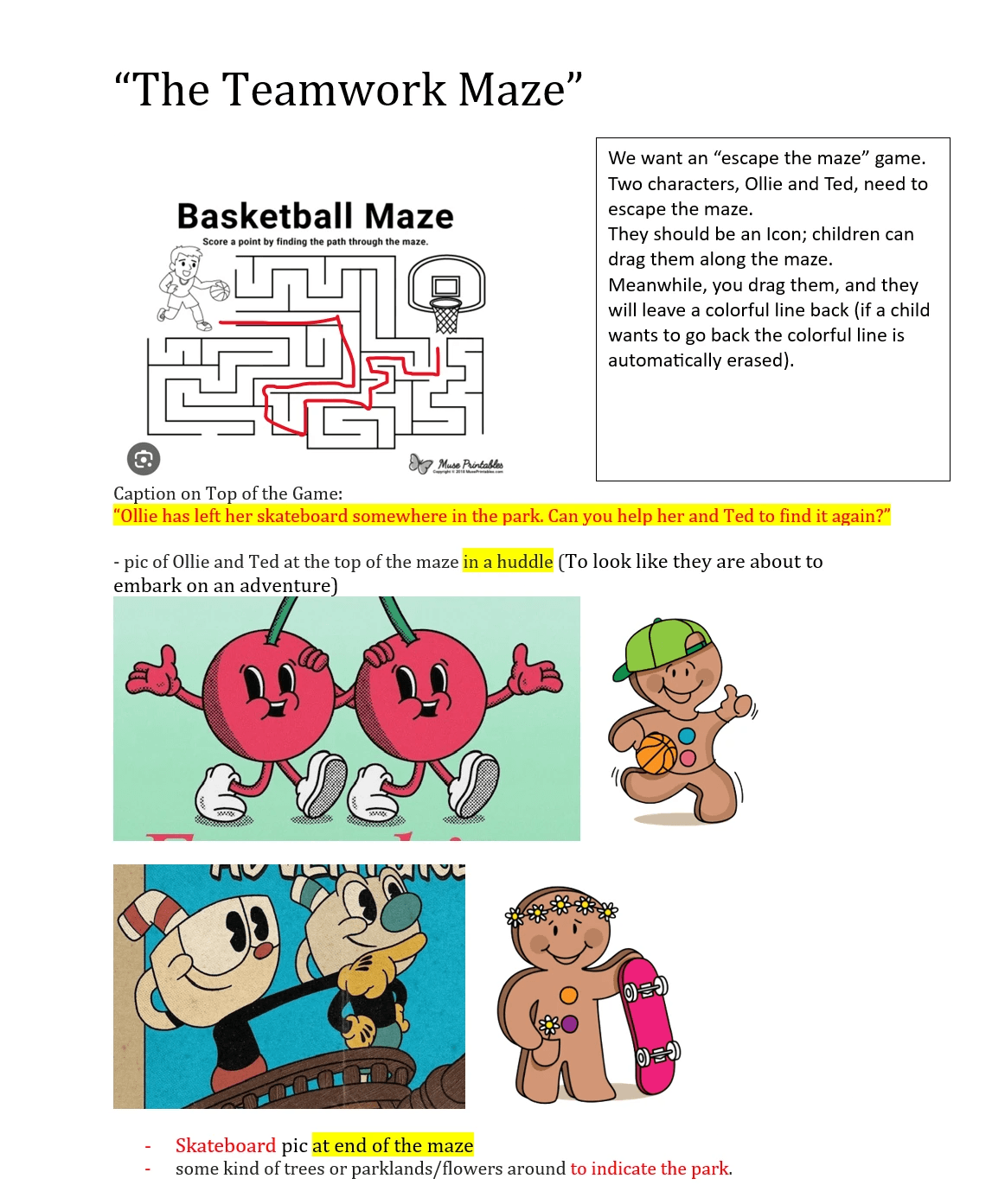 To solidify our ideas, I presented multiple game concepts to the clients. Each concept was accompanied by basic sketches and storyboards that illustrated the gameplay mechanics and narrative structure. After several iterations and input from the client, we unanimously decided on a maze-based adventure game featuring their mascots, Ted and Ollie. The narrative we settled on involved Ollie losing her skateboard in a vast park, turning the search into an exciting maze challenge with Ted aiding in the quest.