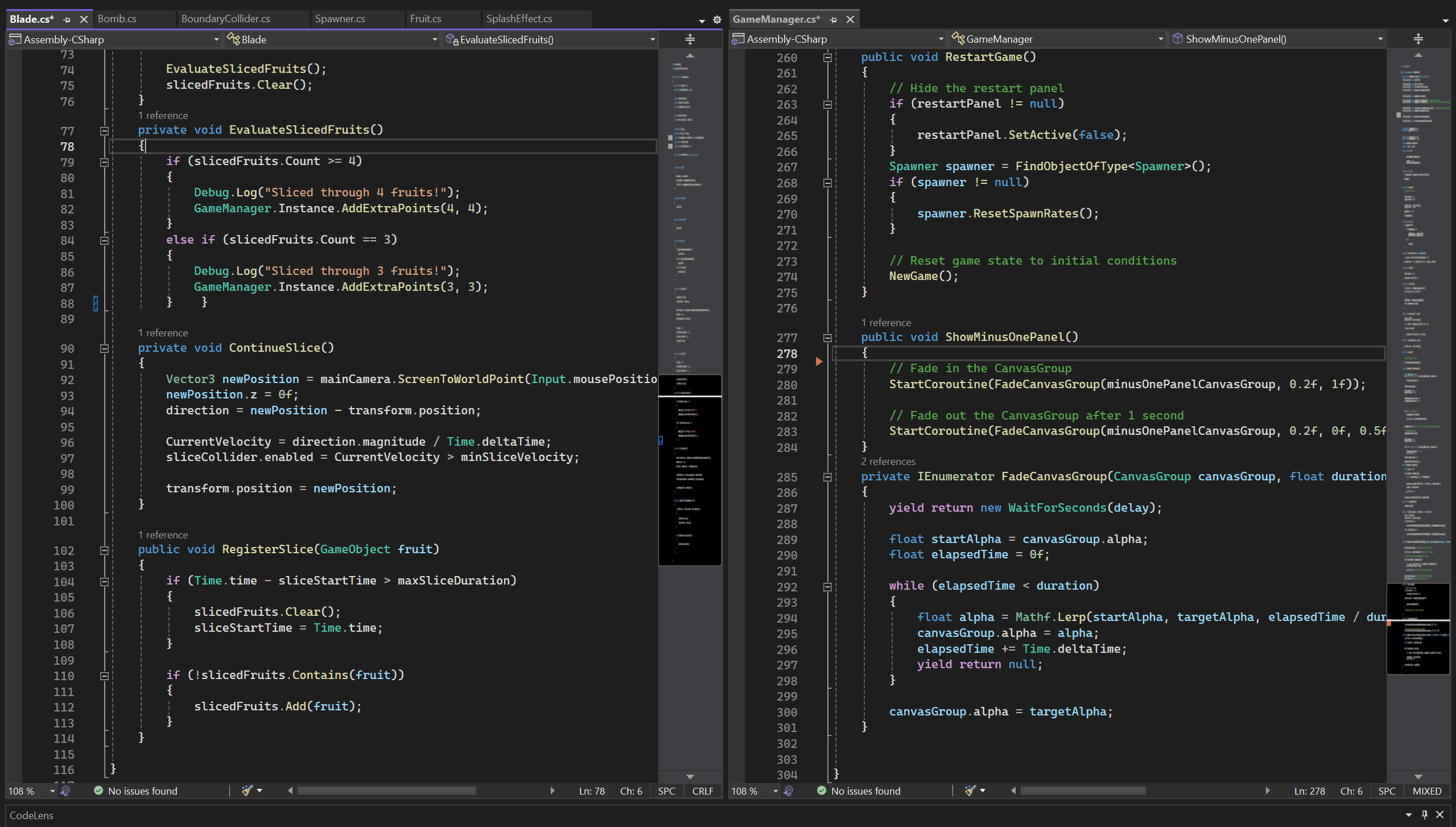 Gameplay Development: I worked on the core gameplay mechanics, focusing on the functionality of fruit slicing and bomb dodging. This involved coding the primary interactions, ensuring responsive controls, and optimizing the game's performance to maintain a smooth user experience.