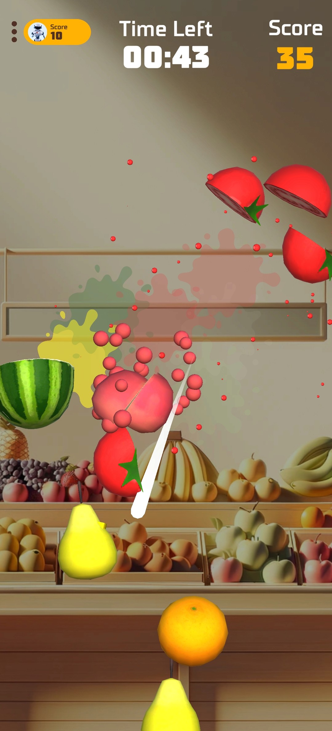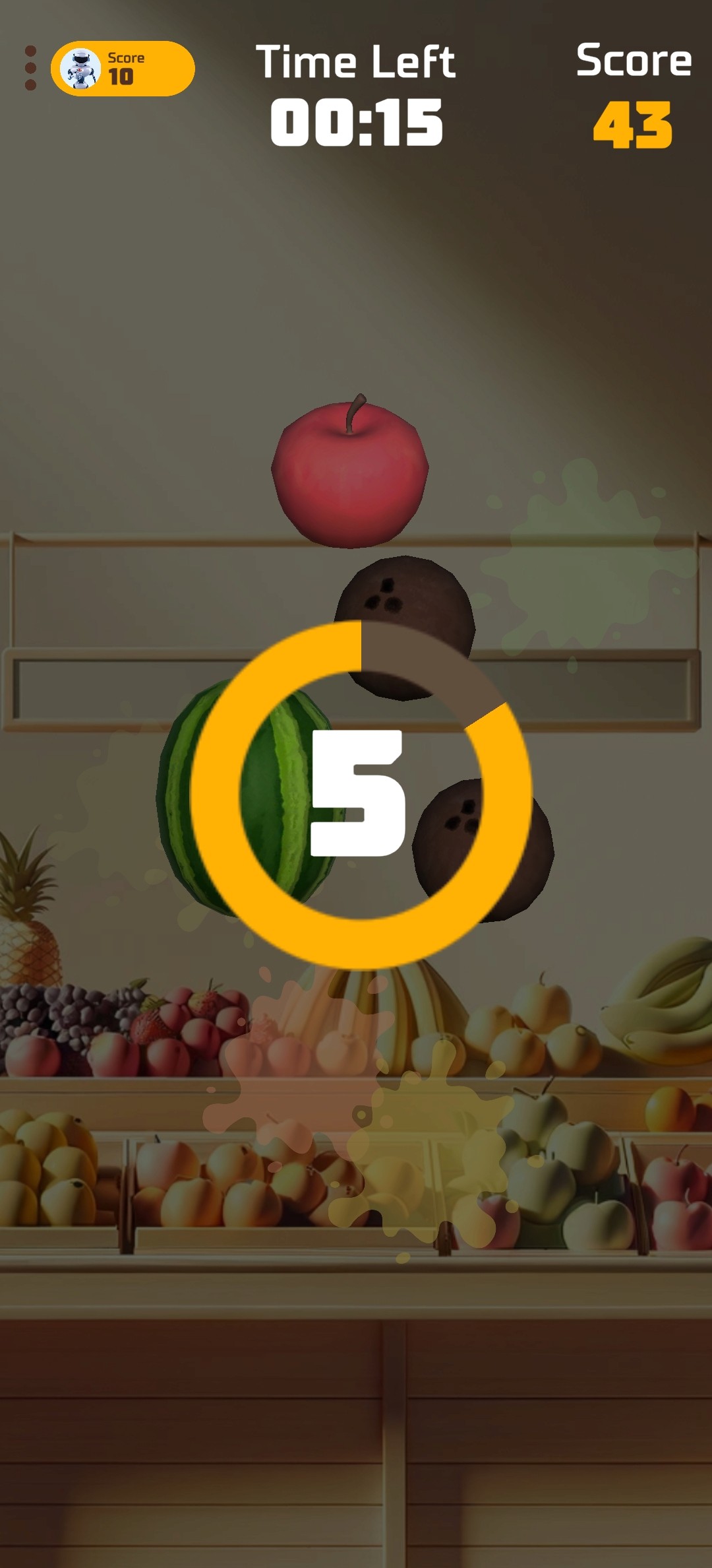 Increasing Difficulty: As players continue to successfully slice fruits without hitting bombs, the game responds by increasing the speed and frequency of the fruits being thrown.