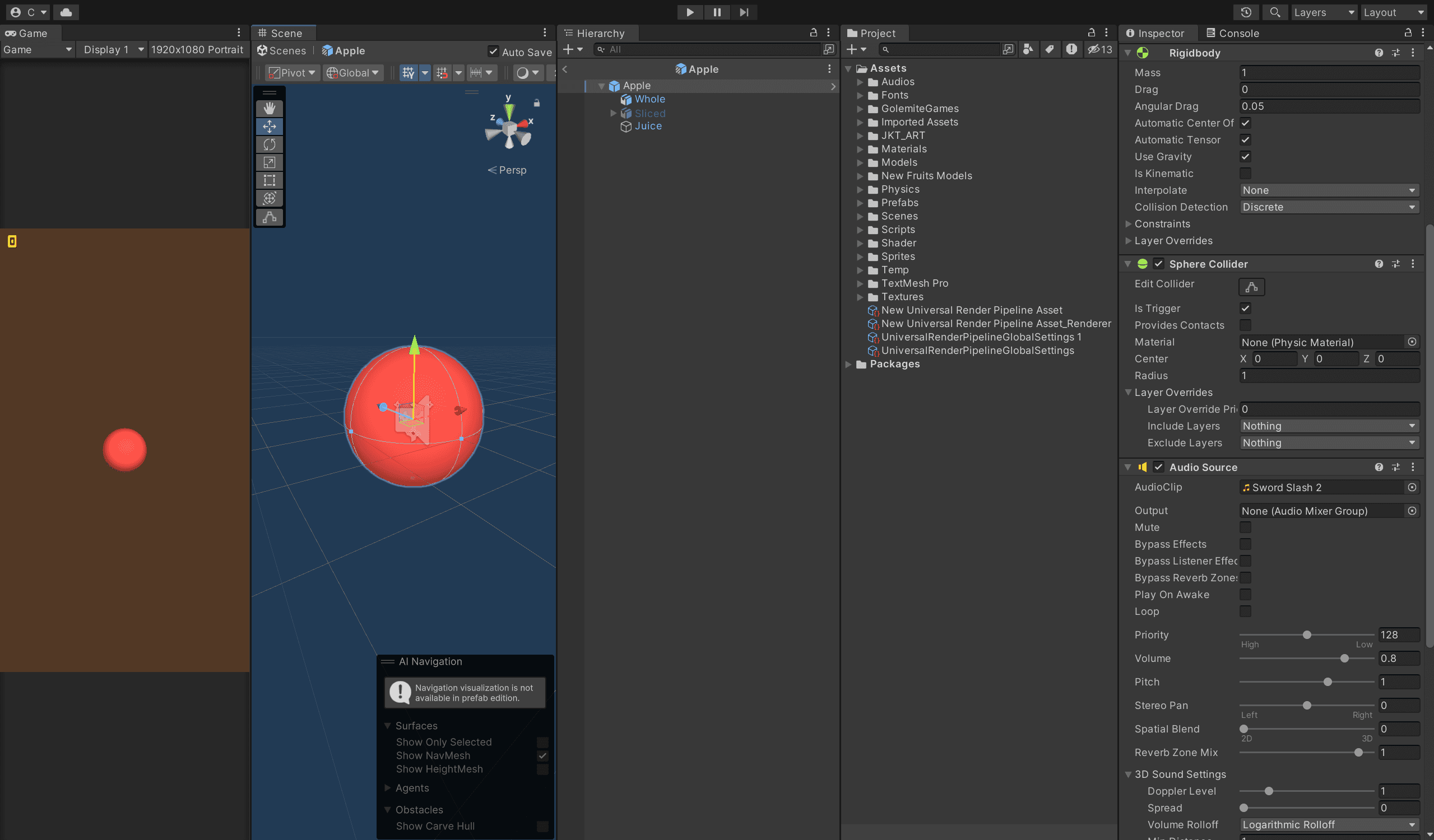 Fruit Spawning involved calculating random spawn points within a predefined area and setting intervals between spawns that adjust dynamically as the game progresses. To maintain gameplay balance and increase difficulty over time, the frequency of fruits was programmed to increase. To test and refine this mechanic, I used placeholder objects (simple spheres from Unity's default assets) which were later replaced by detailed 3D models.