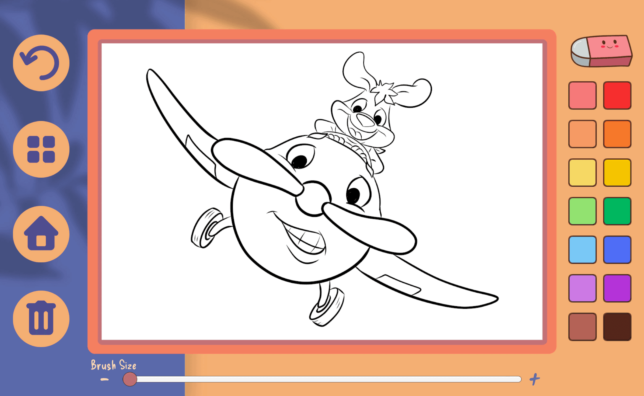 This game offers a selection of 10 coloring pages that depict various scenes and characters from the story "Adventures of Midas and the Little Red Airplane." The game is equipped with an intuitive and child-friendly interface that includes a range of tools and functionalities designed to enhance the experience: